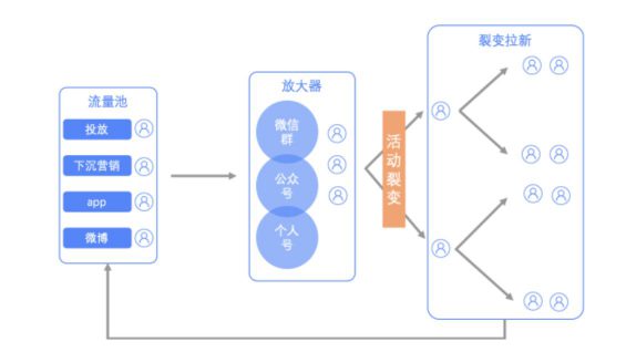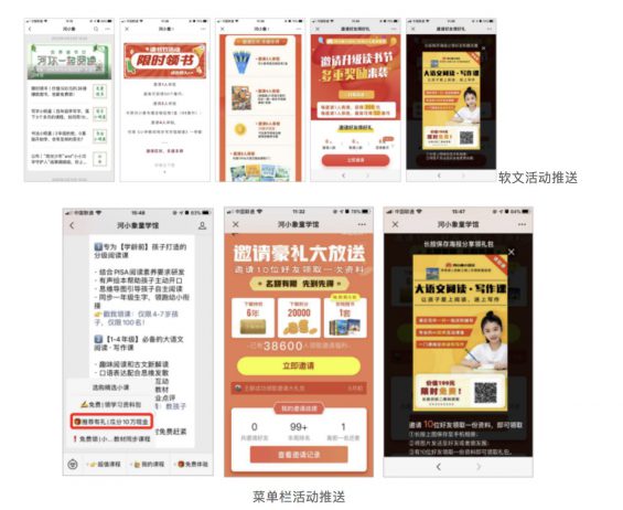 从图中我们可以看出,河小象将其从各个渠道中获取到的流量引导到微信生态。然后通过公众号、个人号、小程序等媒介进行服务。如此一来,用户就会接触到小程序、公众号和群中推送的裂变活动,进行流量的放大。下面将微信活动裂变以及用户自传播进行分析。