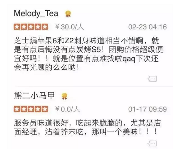 此外,也有一些明显是段子的,和餐厅实际品质不相关的“神评论”被系统打上“优秀点评”的印章[3] 。出现这种情况,都需要回头看下原因是什么,是否有利于点评环境的良性循环。