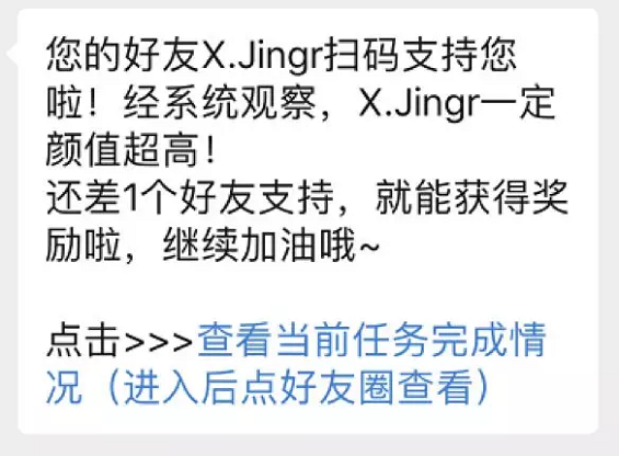 邀请人收到的第一条消息,也就是第一位好友扫码支持时,消息文案要包含好友支持提醒和任务进度提醒。
