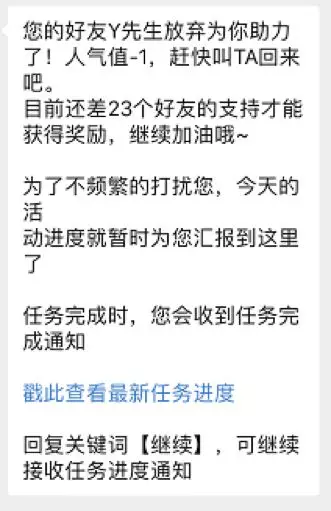 由于有些任务需要的邀请人数可能比较多,为了避免不断打扰粉丝,可以发一个消息提示,让粉丝选择是否继续接收邀请成功的消息,并且附上可以随时查看任务进度的入口。