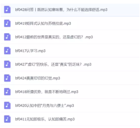 虽然这个盗版的哥们已经很尽心尽力,把一个课程按月份分割开,但进入每个月份后,课程章节依然是杂乱无序,只能人为通过标题里的日期,去尽量区别前后顺序,比如“bf0426无知即极乐,认知即痛苦”和“bf0420认知中的月亮与六便士”。