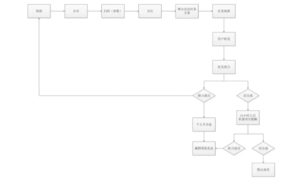 服务号的裂变流程:用户通过海报参数二维码关注公众号,自动弹出模版消息及发送专属海报,写明活动规则、时间以及客服联系方式,活动任务门槛可自行设置,用户每邀请助力一次就自动推送模板消息,显示完成进度,并给出排行榜,排行榜要显示前100名的活动进度及奖品领取情况,用户完成任务后,立刻推送客服微信号,让用户加客服好友并给出完成任务截图及领取奖品。