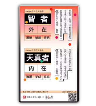 测试答案总结一句话:不管你海报上写了什么理论支撑,但是结果必须是正面的。举个例子,荣格心理学背书,网易让大家做了个测试,结果显示,你这个人内心孤僻,阴暗。你觉得你还会分享出去吗?分享出去是用来装逼的,不是用来自毁形象的。只有夸用户的东西,才可以给用户装逼用。所以,你发现一个很搞笑的事情,题目中的各种理论背书其实和测试结果没有直接关联性。你懂的。