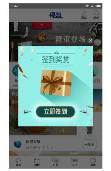 优盟APP的签到活动形式,签到入口是从APP首页直接跳出,以APP首页入口展示给用户,使签到率得到很大的提升。进入签到页面,显示用户签到天数,并罗列出签到可获得的奖励内容,提高用户签到的活跃度。且用户通过签到获得积分可以在APP内兑换商品或享受商品折扣,对于用户来说可以将积分变得更有价值。