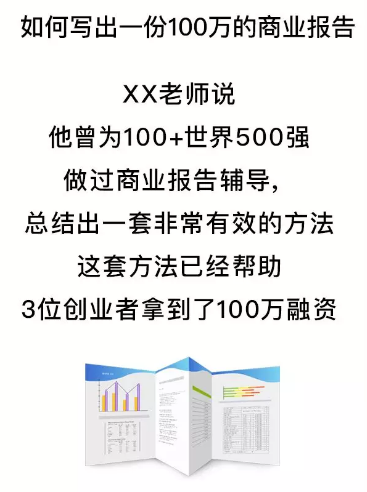 XX老师说,他曾为100+世界500强做过商业报告辅导,总结出一套非常有效的方法,这套方法以及帮助3位创业者拿到了100万融资。