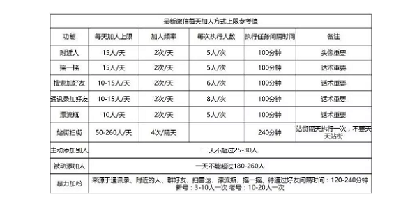 多数人收购微信号,是为了给产品引流。最常见的方法,就是通过“摇一摇”、“漂流瓶”、“附近的人”等功能加人。而加人是有一定限制的,榜妹拿到的一份表格显示,一天主动加人不超过30个,被动加人不超过260个。