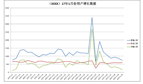 在月工作中,部分的关键数据也可以以折线图的形式进行呈现,比如:用户新增数据。