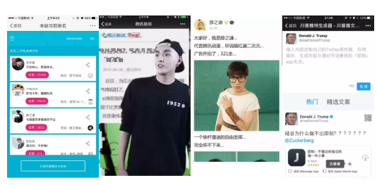 利用明星来做H5广告有《吴亦凡即将入伍》、《薛之谦2个月没写微博段子,结果憋了个大招》,同样的创意和执行,如果换成其他热度不够或者不知名的明星,H5做的再好也很难传播开来。川普经常因为在twitter发一些与总统身份冲突的言论上头条,即刻APP借势川普做了个川普twitter账号言论生成的H5,借助新年的一些高频话语,网友恶搞的不亦乐乎。有个关于咪蒙的段子:如果你(小编)不知道写什么来冲10万+了,就去撕咪蒙。也是内容策划层面的借势人物流量。