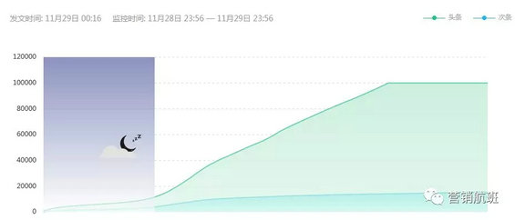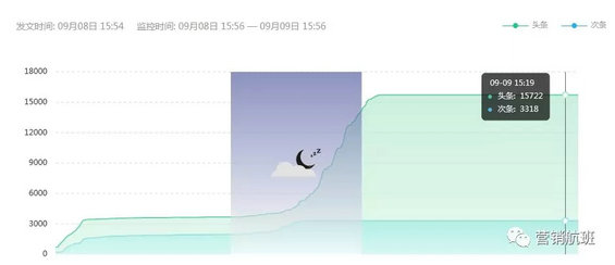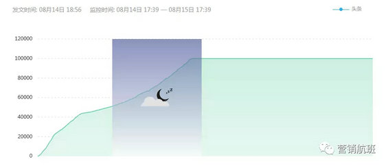 如果公众号是在深夜发文,那么在发文开始阶段阅读数同样是持续上升,而在十二点过后阅读数就进入平稳缓慢增长,直到第二天上午再度迎来一次小幅平稳上升。(这是由于部分读者错过了晚上的推送而选择在第二天一早阅读文章造成的)
