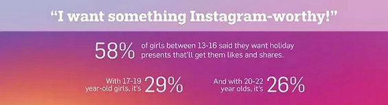 数字媒体公司 SweetyHigh’s 去年针对600名Z世代年轻人(13-22岁的女孩)进行了一次“收送节日礼物习惯及影响因素”的调查,发现58%的人希望收到的礼物可以在社交媒体上收获点赞和分享,在13-16岁的受访者中,52%的人表示希望收到自己愿望清单上列出的礼物,而非得到“惊喜”。