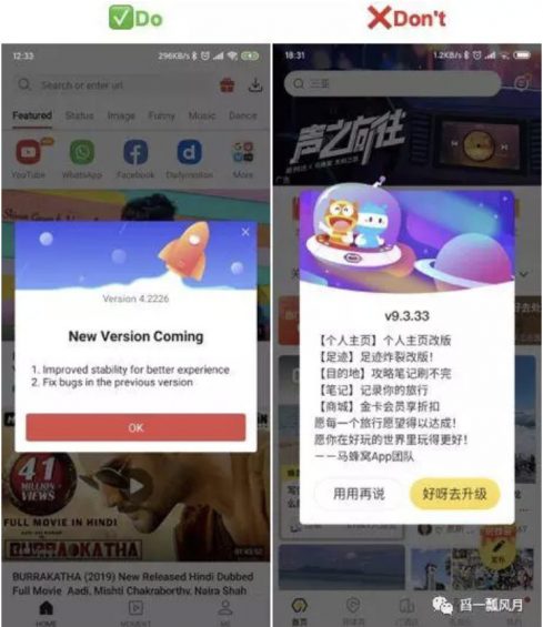 1)升级弹窗首先要表达的是“有新版本了”,其次才是更新内容