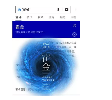 在百度搜索“霍金”时,会有一个悼念霍金的小动画,文案显示“你化作星辰,飞向浩瀚宇宙”。 搜索“黑洞”时,也有对应的动画。以这种方式悼念霍金,我觉得可以。