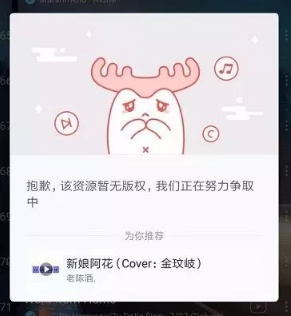在网易云音乐点击歌曲时,若歌曲没有版权,网易云会给你弹出一个示弱的表情,并给你推荐一首类似的歌曲,能减少当时你听歌受阻的挫败感。