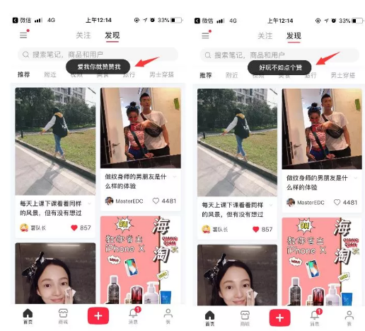 每次点赞,小红书都会显示不同的文案,比如,谢谢你的喜欢、爱你么么哒、你才下次点赞会有什么、点个赞交个友、好玩不如点个赞,爱你你就赞赞我。