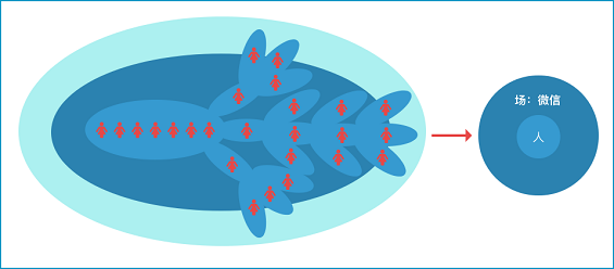 现在,我们可以说社交电商是“场+货+小B”三者组成的动态的裂变场,然后再通过微信这个“场”去找“人”,借鸡生蛋。