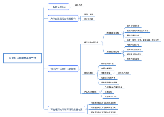 那么运营后台如何进行重构呢?有没有可以一些可以借鉴的方法和规律呢?接下来我会从运营后台重构的基本原则、产品层面规划、