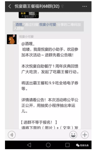 有些店本身就有把用户留存在自己的平台上的习惯,这个是非常好的。我们在在山东悦宴自助餐做裂变之前,这家店是没有多少用户数的,店的客服微信号只有几百人。所以我们前期给他们做营销咨询时,先让他们通过两种方式去积累用户数量。