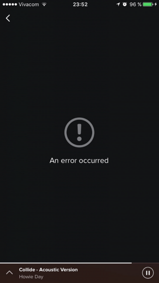 错误示例,Spotify 操作出现错误时显示的空白状态,只显示错误发生了,然而对于用户来说,这没有任何帮助。