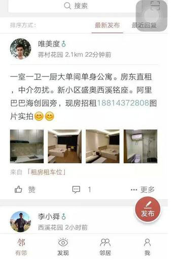 APP上的第一个版块“有邻”,只限于区域内成员发帖交流,包括约伴、求助、租房等内容,相当于一个小型本地化的社区。
