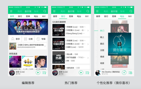 在QQ音乐的APP中,音乐馆的推荐模块是编辑推荐,人工干预力度较大,主要推荐新歌和应景的歌单。排行榜属于热门推荐模块,都是算法计算出的结果,反应了平台用户最喜欢的歌曲。猜你喜欢是个性化推荐的产品,经历过多次改版后,目前可以算是国内领先的个性化推荐系统,具有非常不错的口碑。