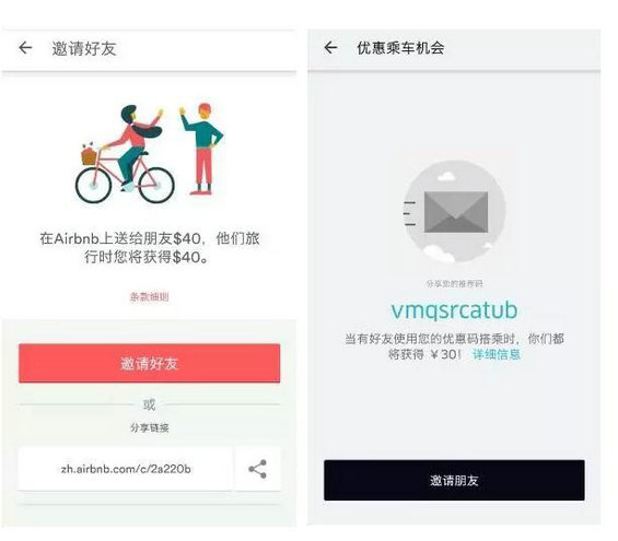 在分享机制上,Uber和Airbnb是做的非常好的,值得大家来参考。这两个产品的分享采用的是User Referral,可以理解为「介绍人机制」。采用一对多的方式,让用户介绍自己使用的产品,推荐给好友使用,一旦成功推荐,好友开始使用产品了,那么推荐者和被推荐者都都会获取奖励。