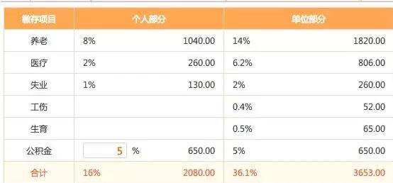 除工资的部分,还要平均为每个员工多缴纳 3653元的五险一金支出,员工部分的支出是 (13000+3653)*8=133224元/月。