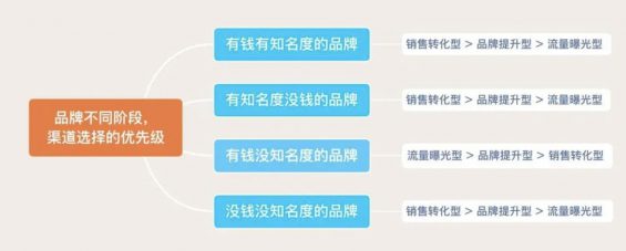 - 「有知名度没钱的品牌」,既然没有充足的预算,那就要先做好销售转化型渠道,花出去的钱能够为品牌带来更多的收入,品牌才会愿意投入更多的资源和钱来做渠道推广。