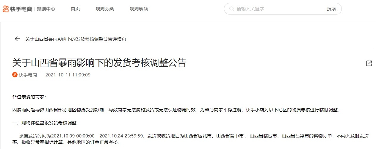 除此之外,快手电商今日还发布了《关于山西省暴雨影响下的发货考核调整公告》。