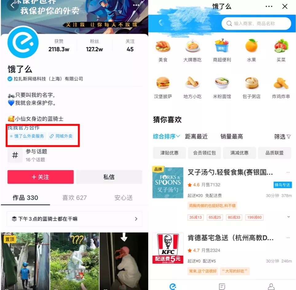 8月中旬,又有媒体报道,抖音实现了点外卖的功能,饿了么、美团外卖,以及喜茶等消费品牌的外卖服务已经打通。用户可通过3种途径,从抖音平台跳转至外卖下单页面,实现在抖音上点外卖的功能。