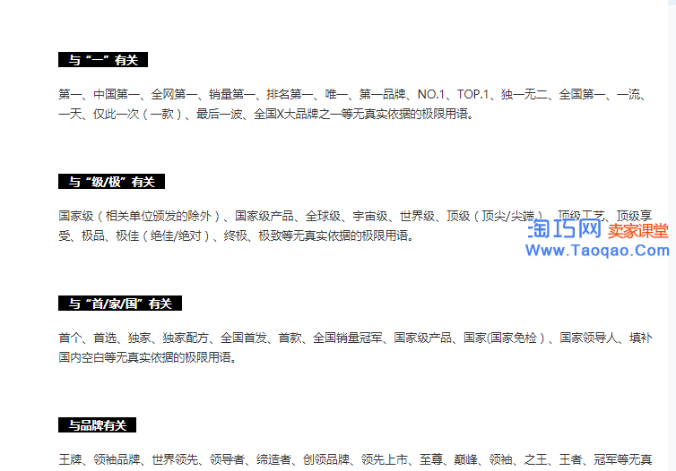 很多商家喜欢用些极限词或者是敏感词来证明自己的宝贝独一无二甚至是非常厉害,但是这样的词用上去不仅不能为你来带既定的效果,反而还会让你触碰红线,不管你是无意还是想挑战规则,这样的方式只能让你受到处罚,下面来看下广告法里面哪些词是我们不可以用的: