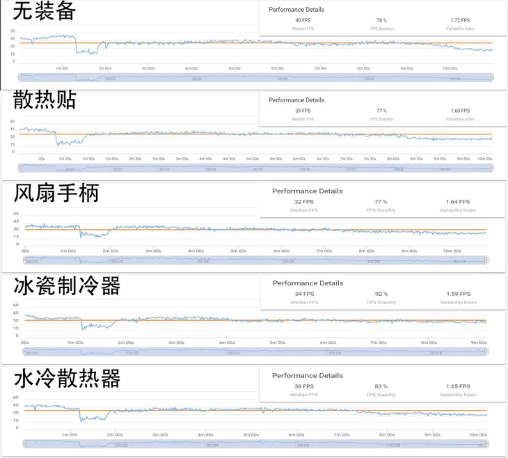 四款散热器的效果已经很明显了,散热手柄的效果并不理想,分析原因可能因为手机发热区域正好在两个风扇中间,风扇吹的风不能直接作用在最热的区域。而且这个手柄的设计很奇怪,通常游戏手柄都是在手机两侧,而它的这个设计会直接导致手指摸不到屏幕上半部分。