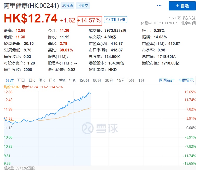 10月20日消息,今早,阿里健康股价持续走高,截至中午港股休盘,阿里健康股价涨幅扩大至14.57%,报12.74港元,总市值1718.60亿港元。