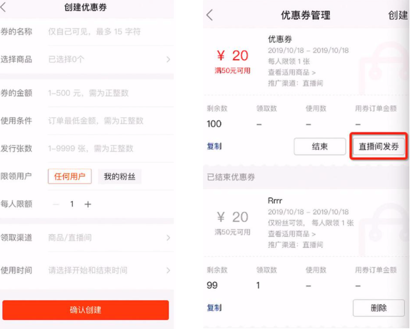 ①如需在直播间发券,领取渠道需选择直播间 ;如图: