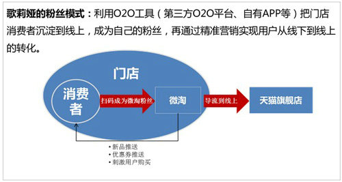 歌莉娅在O2O方面选择了与阿里旗下的微淘合作,去年10月,歌莉娅在精选出的全国各地近百家门店内摆放了微淘活动物料,吸引到店顾客通过扫 门店内的二维码成为歌莉娅微淘粉丝,再加上店铺营业员的针对性引导和现场扫码引导,短短5天内让歌莉娅的粉丝增长了20万,据统计活动期间共有超过110万用户打开手机访问了歌莉娅天猫店铺。