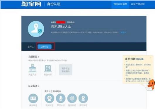 3、点击上图中的“立即认证”选项后,用户进入新界面,需要提交淘宝网身份认证信息。用户可以点击页面中的“立即认证”按钮,如图所示: